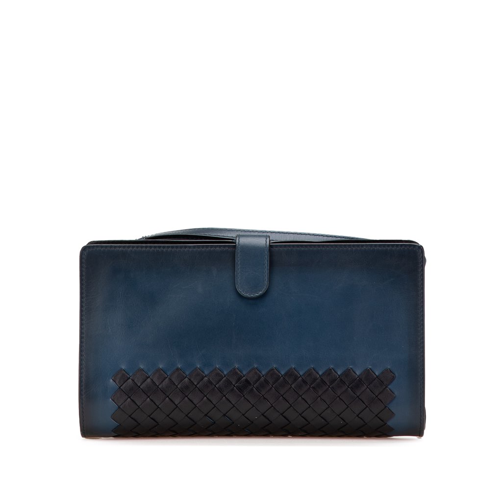 This clutch bag features a nappa leather body with woven details, a flat leather wrist strap, a top strap with a clasp closure, a zip compartment, an exterior back zip pocket, and interior zip and slip pockets.