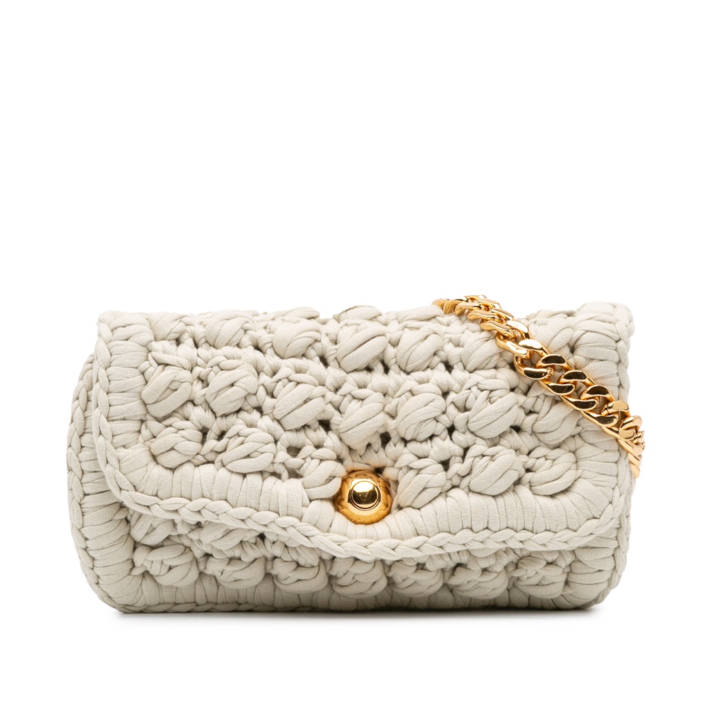 This shoulder bag features a woven jersey body, gold-tone chain shoulder straps, and a front flap with metal lock closure.