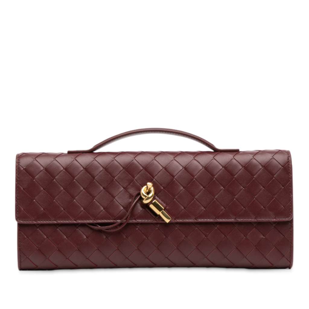This clutch bag features a woven lambskin leather body, flat leather top handle, a front flap with turn lock closure, and interior slip pockets.