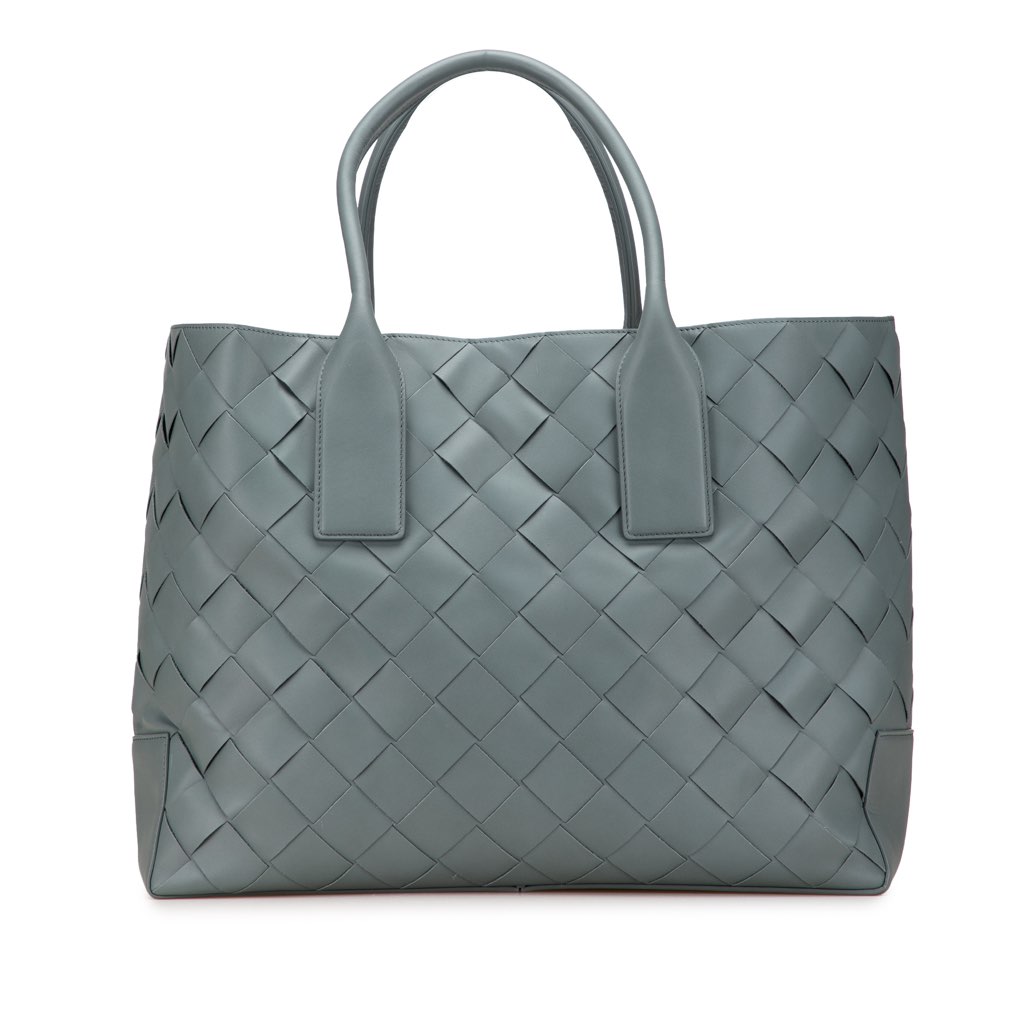 This tote features a woven lambskin leather body, rolled handles, an open top, and a detachable zip pouch.