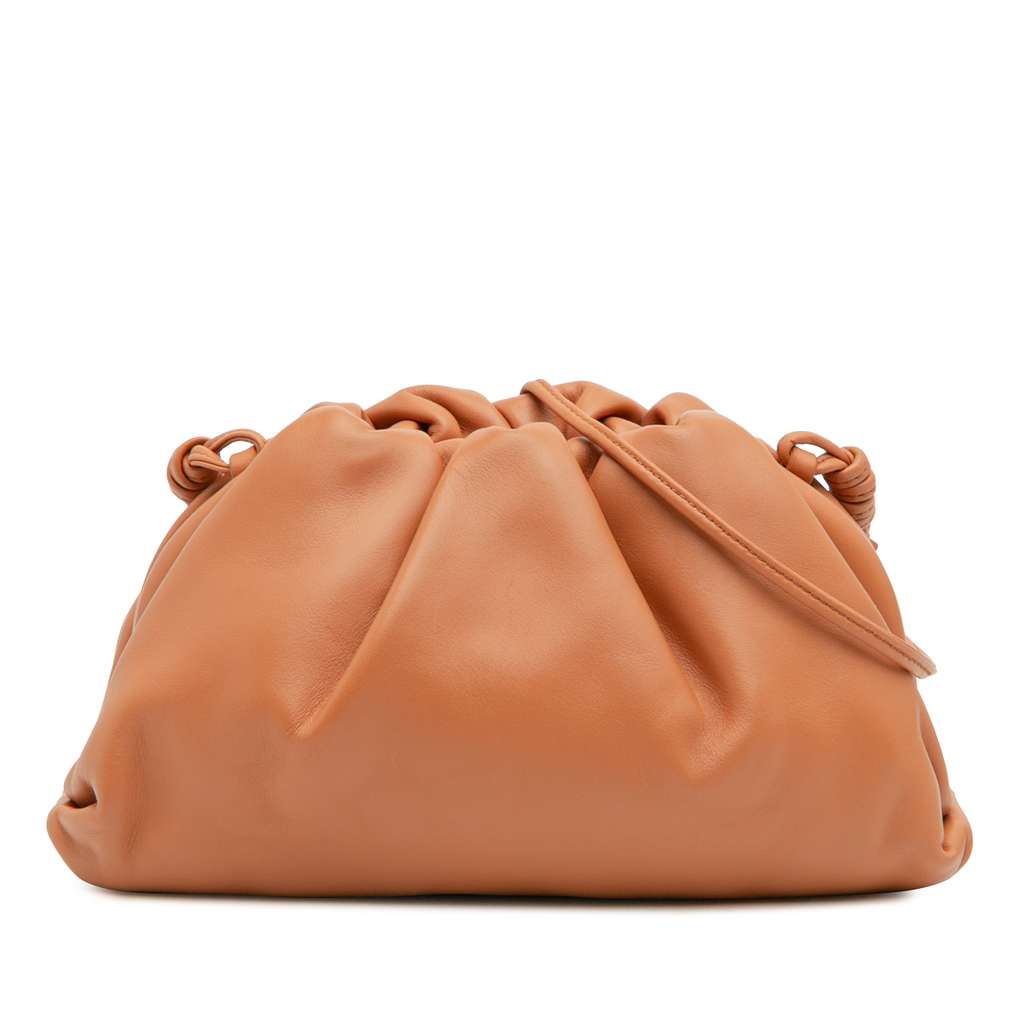The Mini Pouch crossbody features a leather body, a flat leather shoulder strap, and a top snap closure.