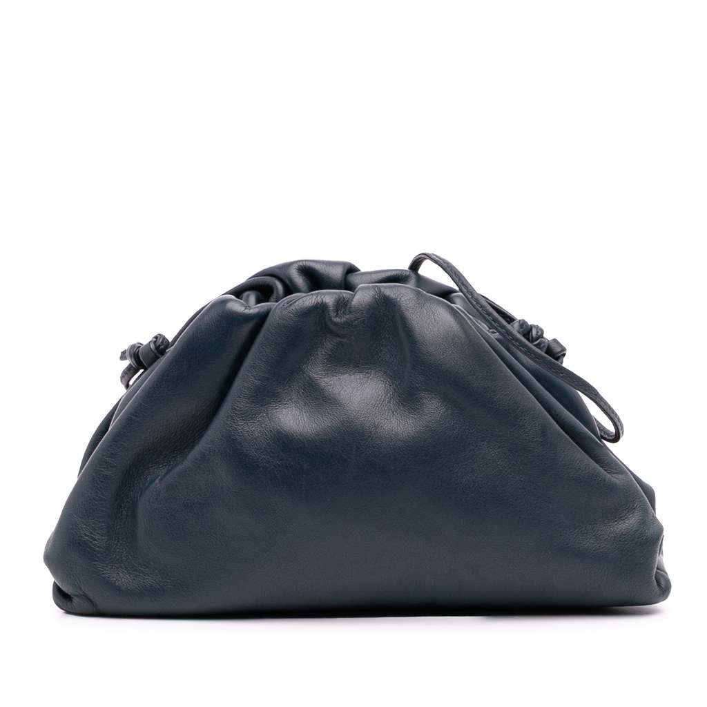 The Mini Pouch features a leather body, a flat leather strap, and a magnetic closure.