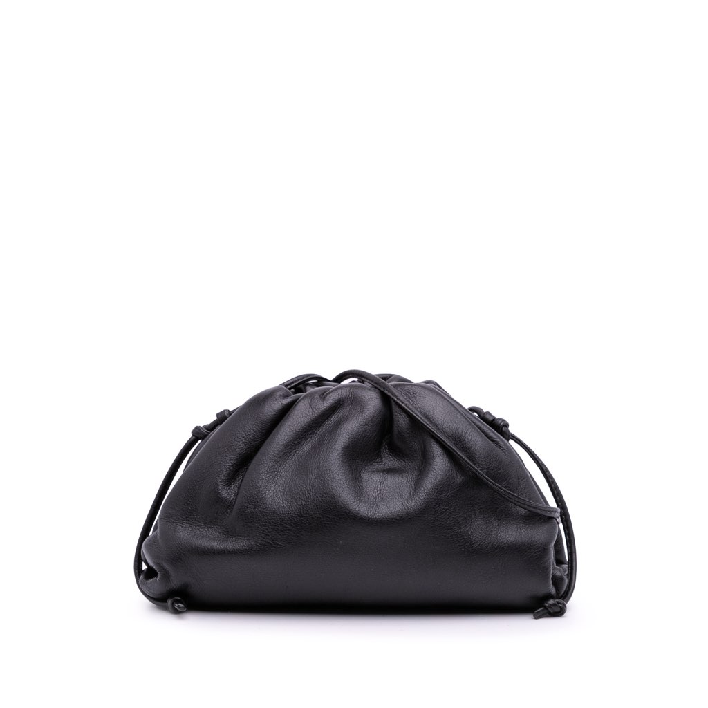 The Pouch features a lambskin leather body, a flat leather strap, and a magnetic closure.