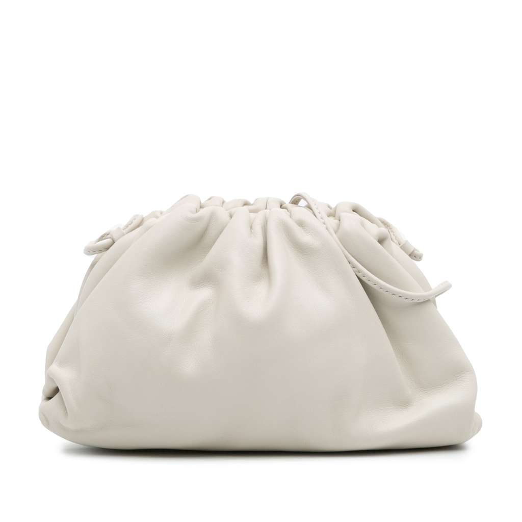 The Mini Pouch features a leather body, a leather strap, and a magnetic closure.