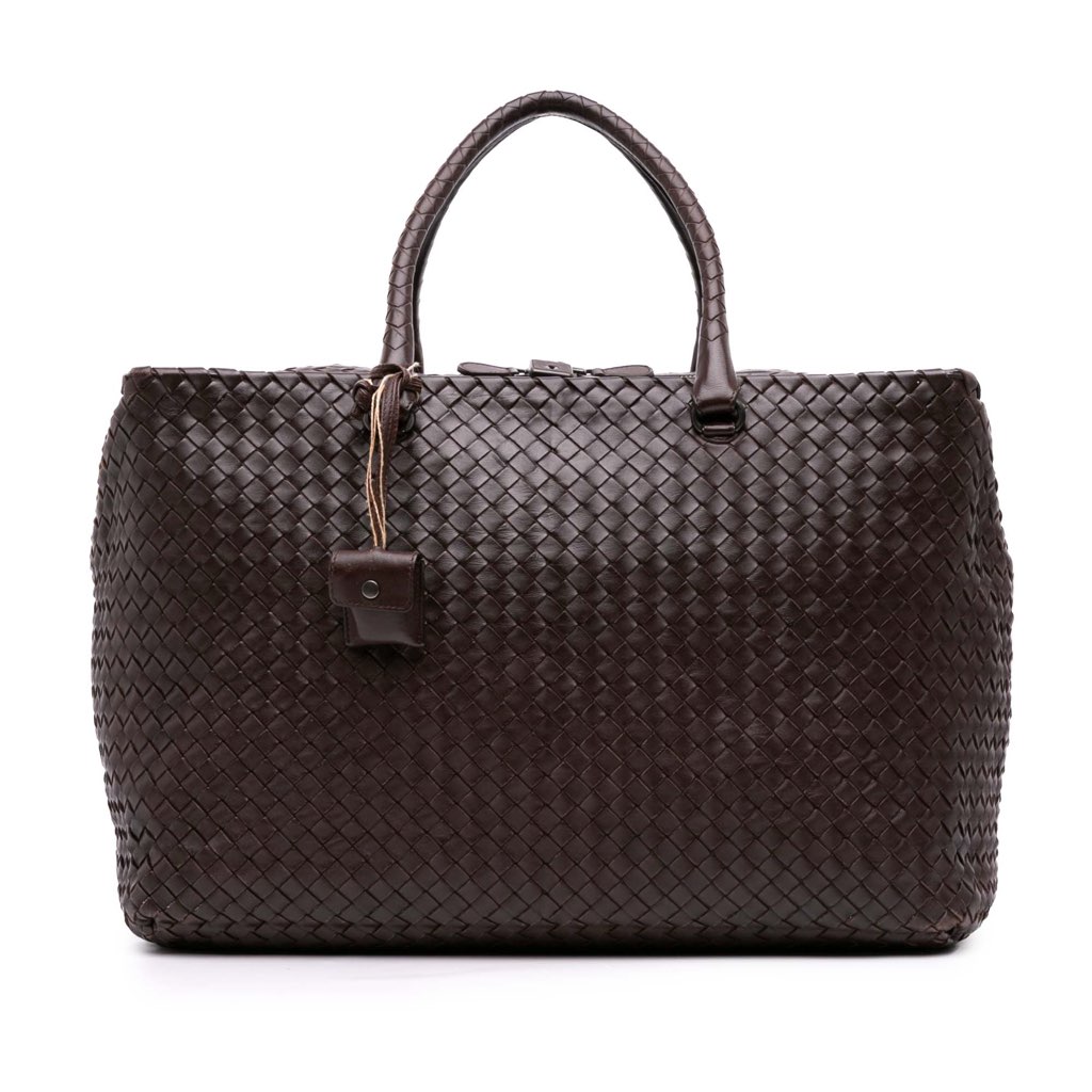 The Brick features a woven nappa leather body, rolled leather handles, a top zip closure, and interior zip and slip pockets.