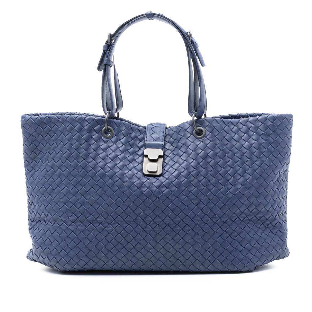 This tote bag features a woven leather body, adjustable flat leather handles, an open top with a top strap closure, and an interior zip pocket.