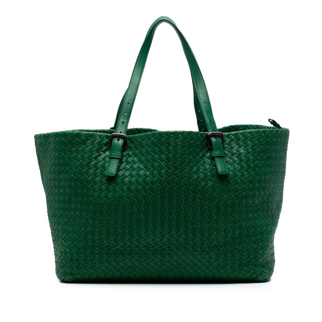 The Cesta tote bag features a woven leather body, adjustable flat leather straps, an open top with a lobster clasp closure, and interior zip and slip pockets.