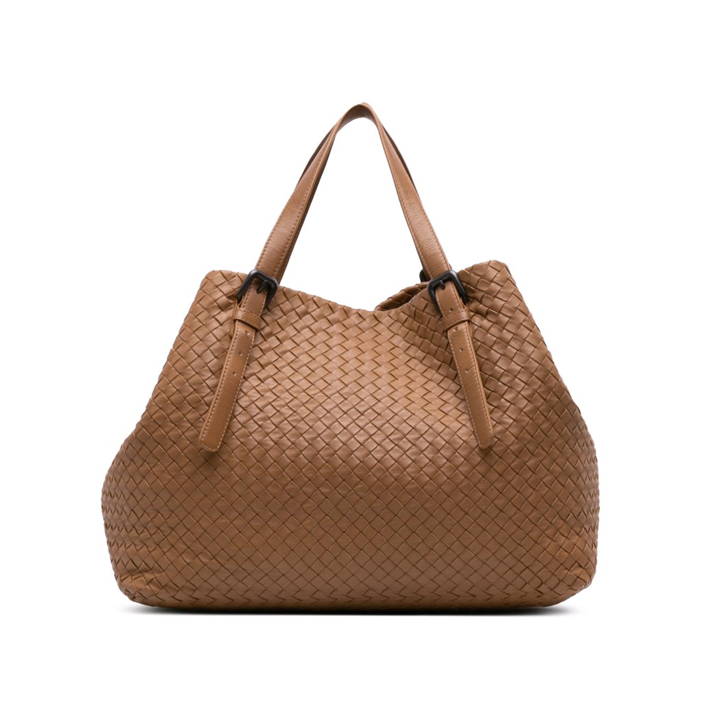 The Cesta tote bag features a woven leather body, adjustable flat leather straps, an open top with a snap clasp closure, and interior zip and slip pockets.