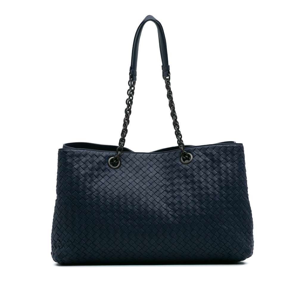 This tote bag features a woven leather body, curb chain straps with leather guard, an open top with magnetic snap closure, an interior zip compartment, and interior zip and slip pockets.