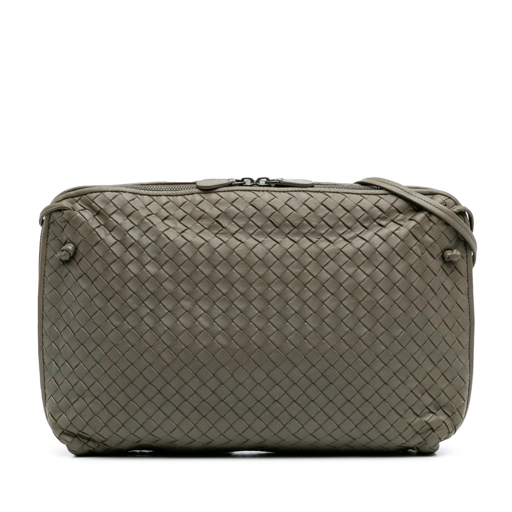 This crossbody bag features a woven leather body, a flat leather strap, a top zip closure, and interior zip and slip pockets.