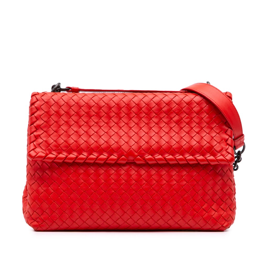 The Intrecciato Olimpia bag features a woven leather body, chain link straps with leather guard, a top flap with magnetic closure, and interior zip and slip pockets.