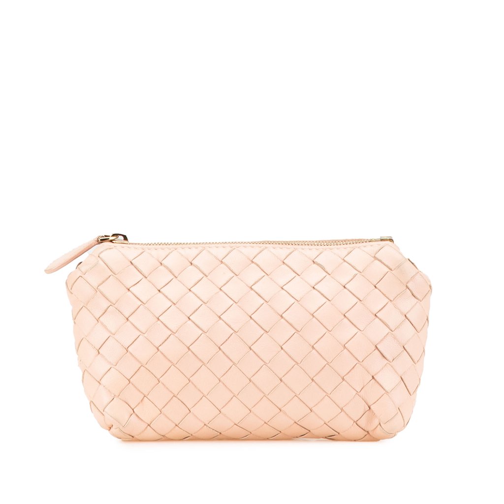 This pouch features a woven leather body and a top zip closure.