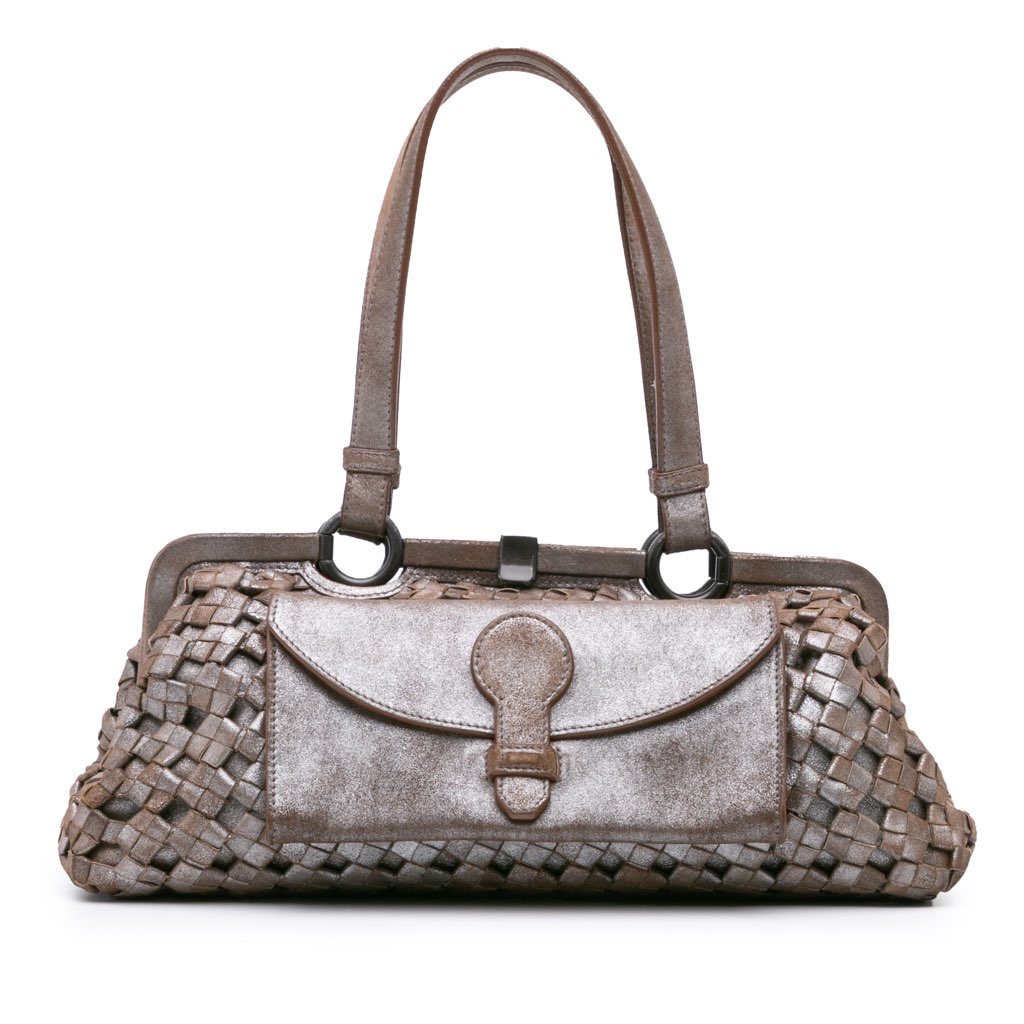 This shoulder bag features a woven leather body, flat leather straps, a top clasp closure, an exterior flap pocket, and an interior slip pocket.