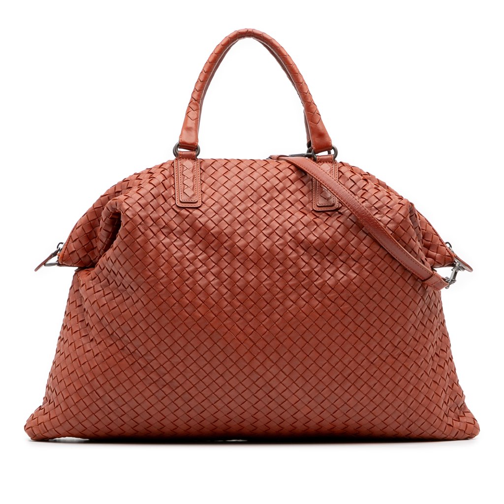 This travel bag features a woven nappa leather body, rolled leather handles, a detachable flat strap, a top zip closure, and interior zip and slip pockets.