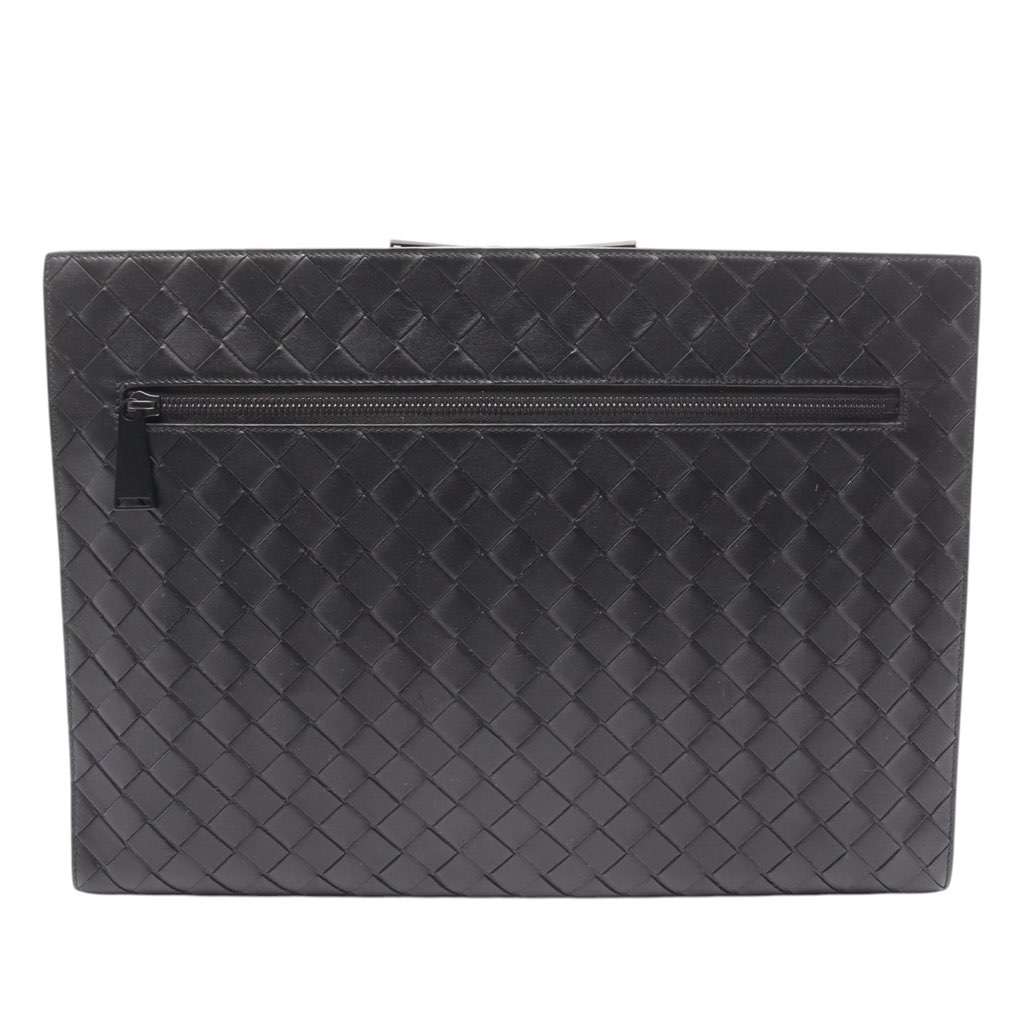This clutch bag features a woven leather body, a dual zip around closure, an exterior zip pocket, and interior slip pockets.