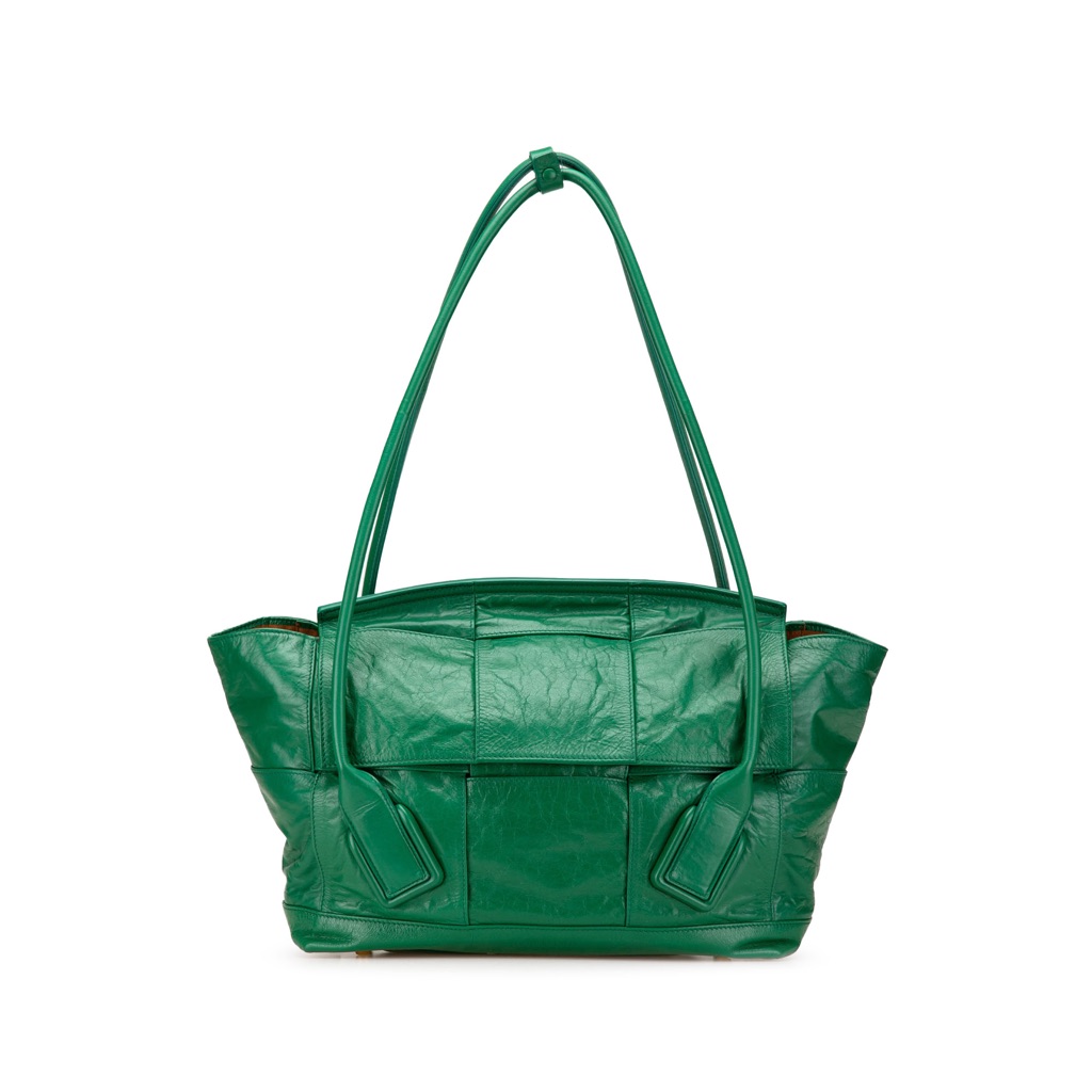The Arco tote bag features a woven leather body, rolled handles, a front flap closure, and interior zip and slip pockets.