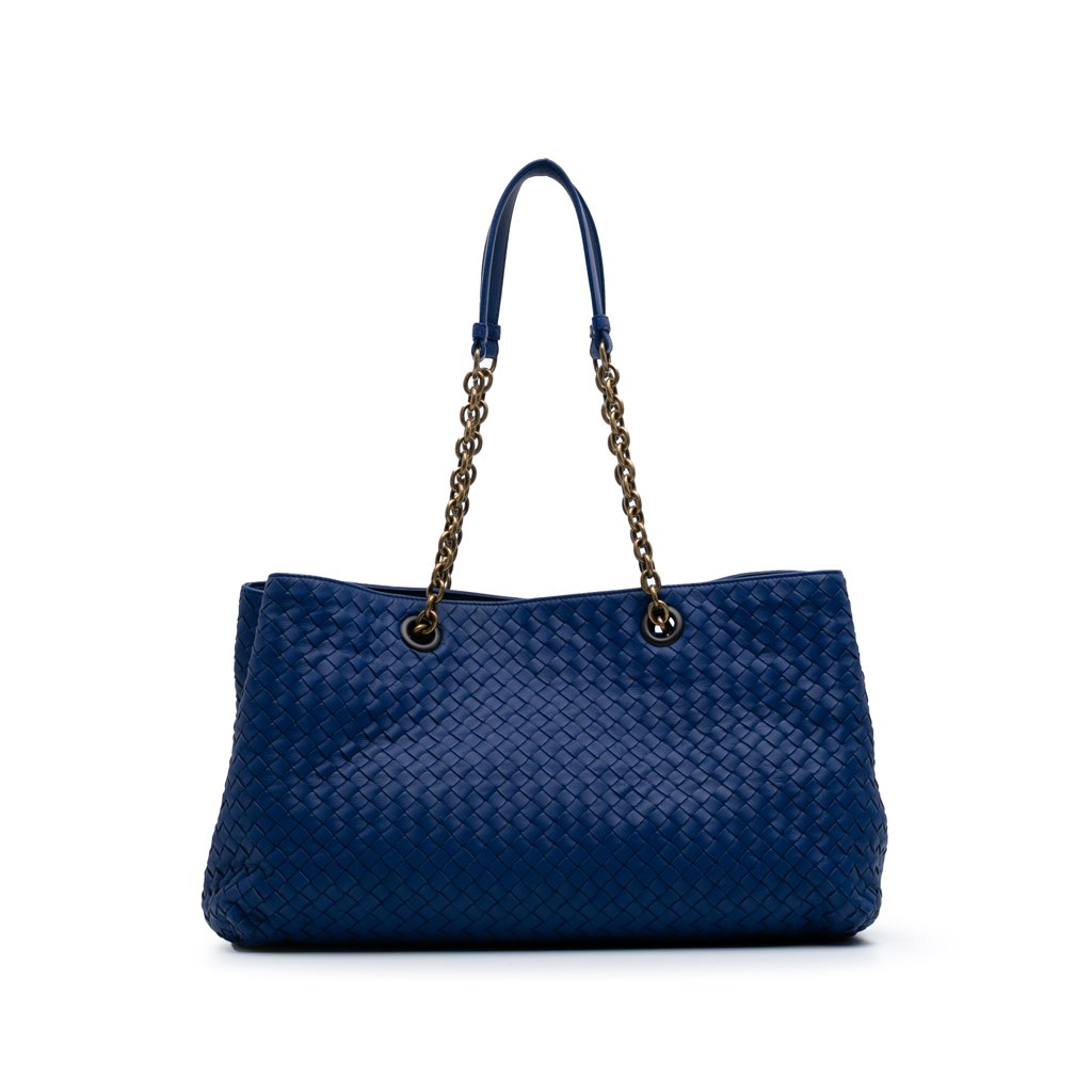 This tote bag features a woven nappa leather body, chain link straps with leather guard, an open top with magnetic snap closure, an interior zip compartment, and interior zip and slip pockets.