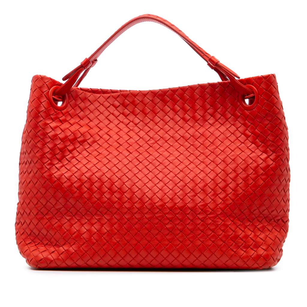 This tote bag features a woven leather body, flat leathers handles, an open top, and interior zip and slip pockets.
