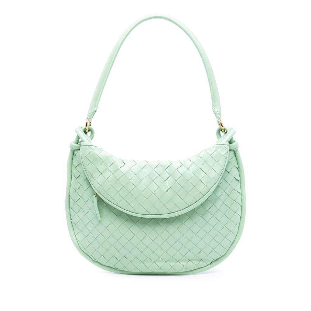 The Gemelli features a woven leather body, a rolled shoulder strap, a top zip closure, a detachable exterior zip pouch, and an interior zip pocket. The strap was repainted.