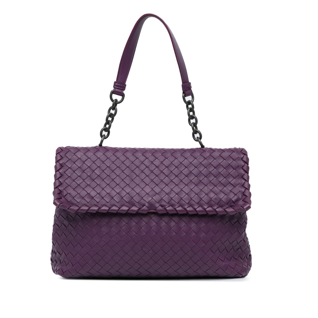 The Olimpia bag features a woven leather body, a chain link strap with leather shoulder guard, a front flap with magnetic closure, and interior zip and slip pockets.