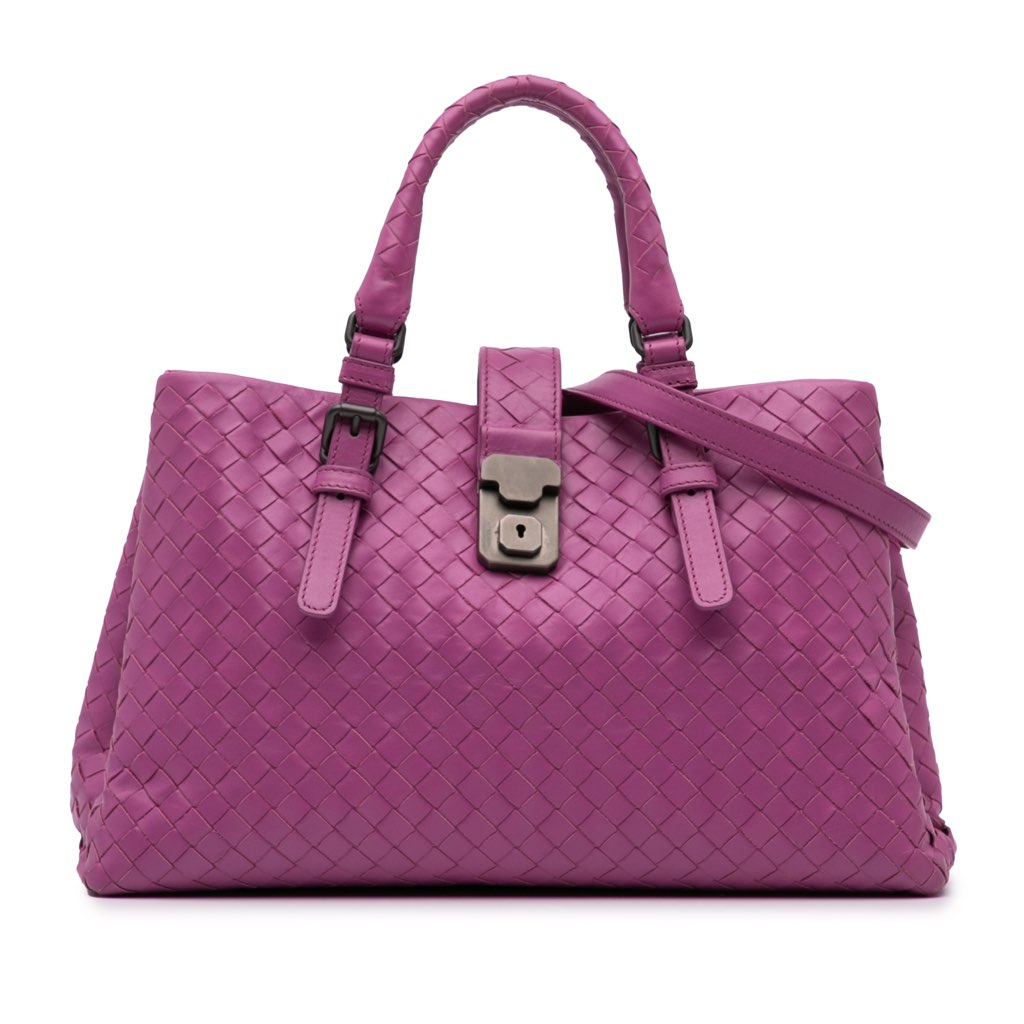 The Roma features a woven nappa leather body, rolled leather handles, detachable flat leather strap, a top strap with a push lock and magnetic closure, interior compartments, and interior zip and slip pockets.