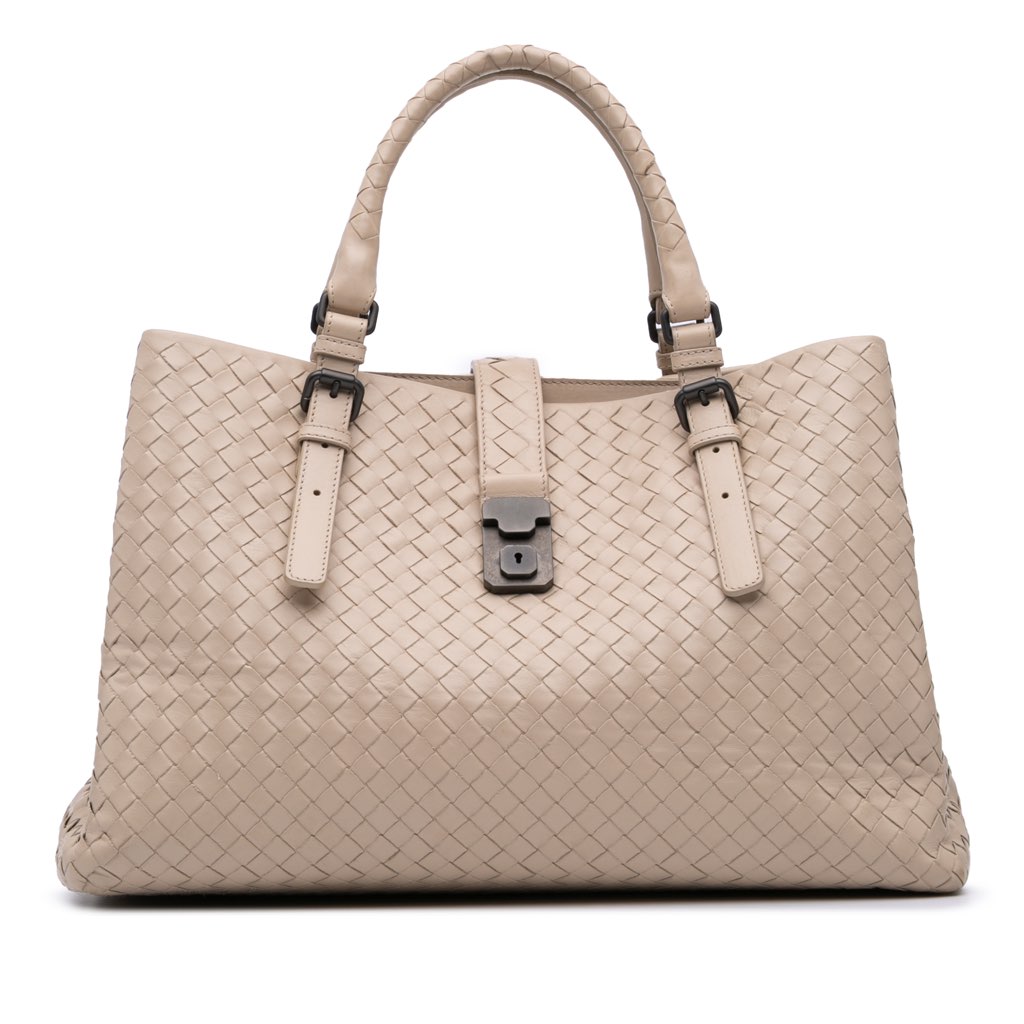 The Roma Tote bag features a woven nappa leather body, rolled leather handles, a top strap with a push lock and magnetic closure, interior compartments, and interior zip and slip pockets.
