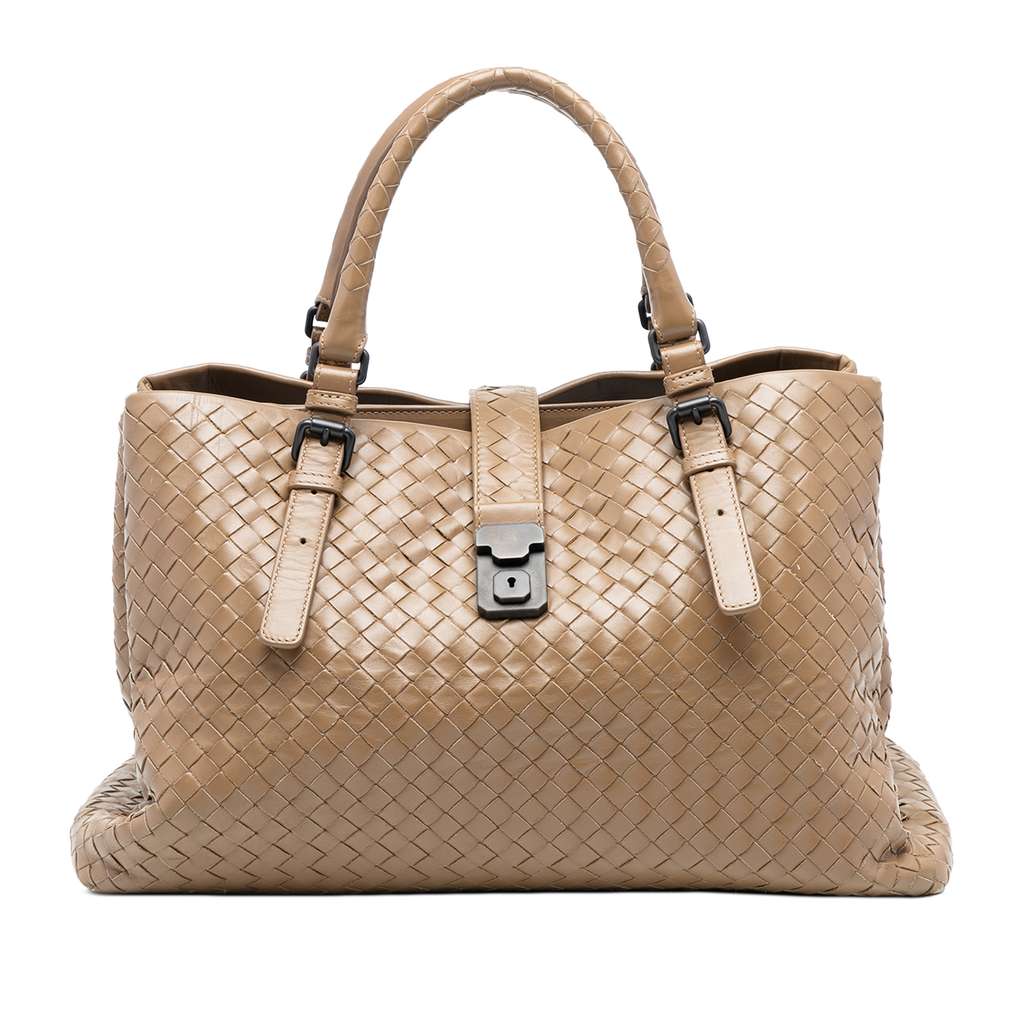 The Medium Roma tote features a woven nappa leather body, rolled leather handles, an open top with a strap and a push lock and magnetic snap closure, interior compartments, and an interior zip pocket.
