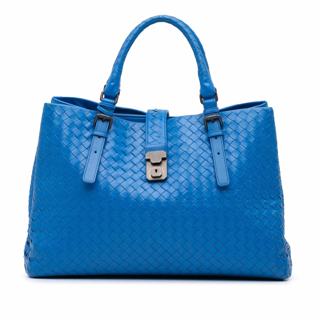 The Roma features a woven leather body, rolled leather handles, an open top with a top strap and push lock closure, and interior zip and slip pockets.