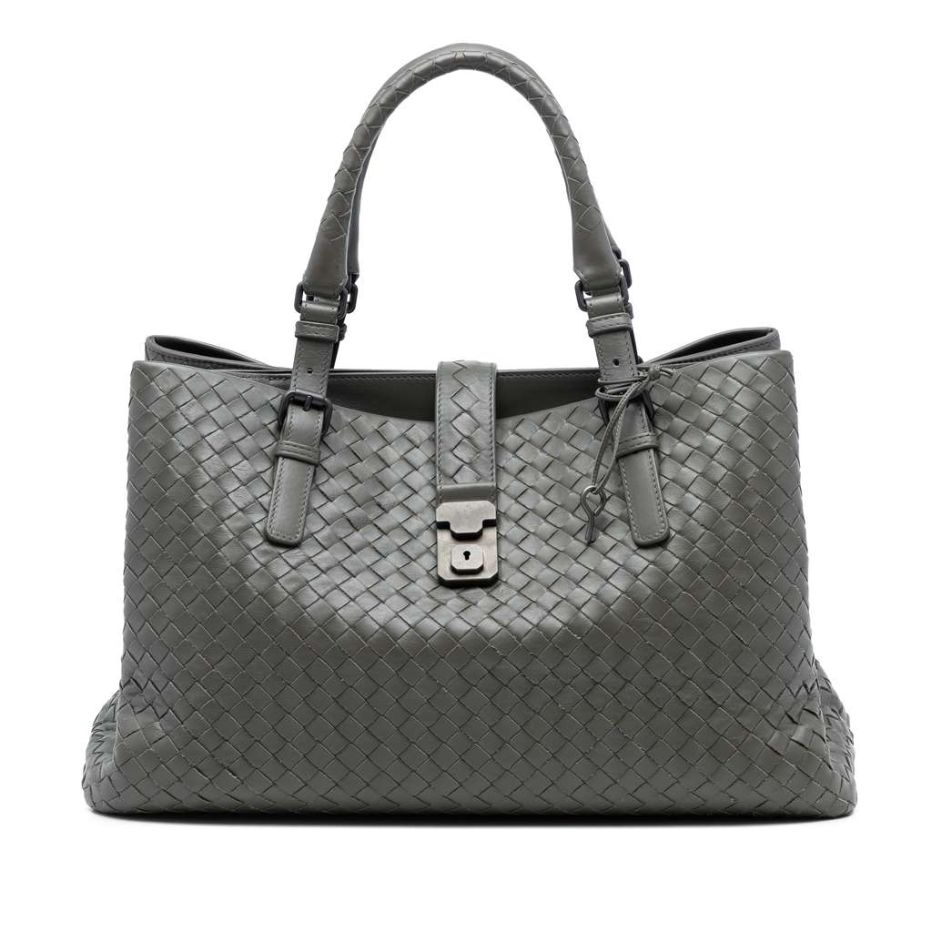 The Medium Roma features a woven nappa leather body, rolled leather handles, an open top with a top strap and push lock closure, and interior zip and slip pockets.