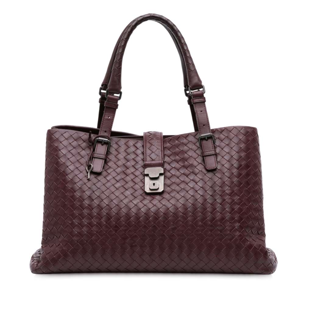 The Roma features a woven nappa leather body, rolled handles, a top strap with a push lock and magnetic closure, interior compartments, and an interior zip pocket. Handles has been repainted.