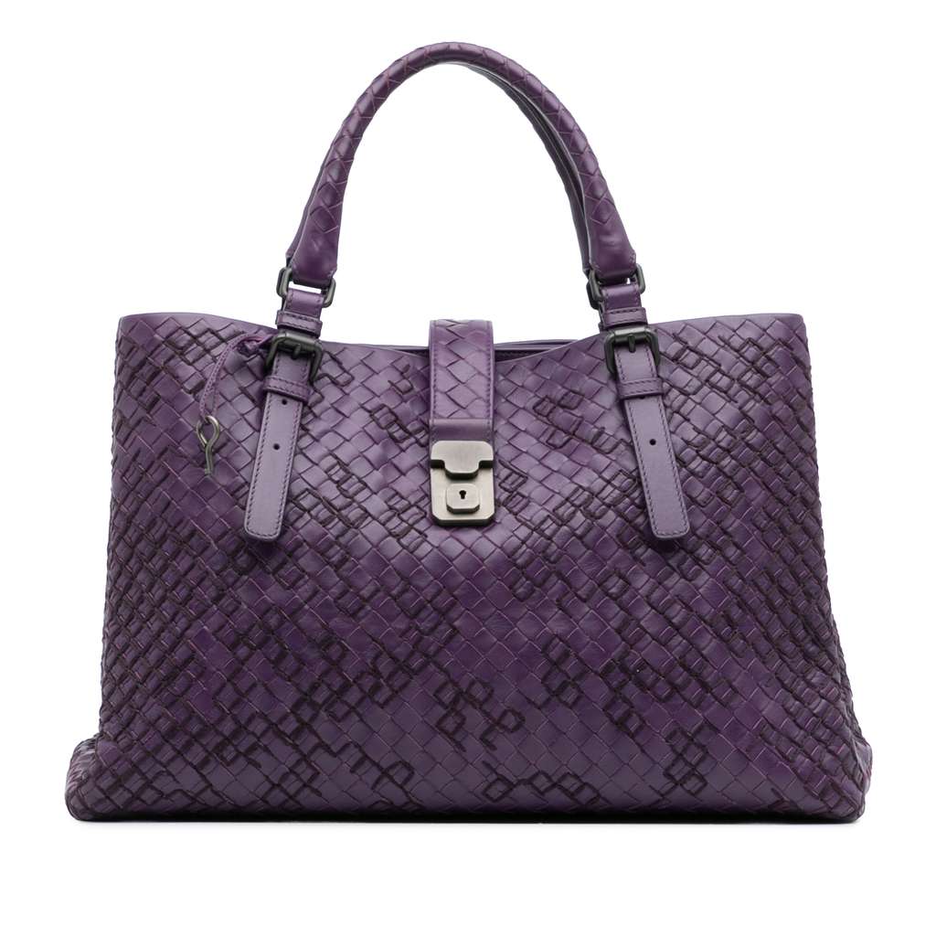 The Roma tote features a woven nappa leather body with stitch details, rolled leather handles, an open top with a top strap and push lock closure, and interior zip and slip pockets.