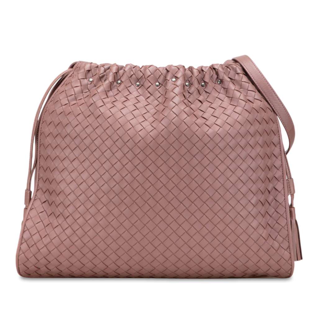 This crossbody bag features a woven nappa leather body, an adjustable flat leather shoulder strap, an open top with drawstring closure, and interior zip and slip pockets.