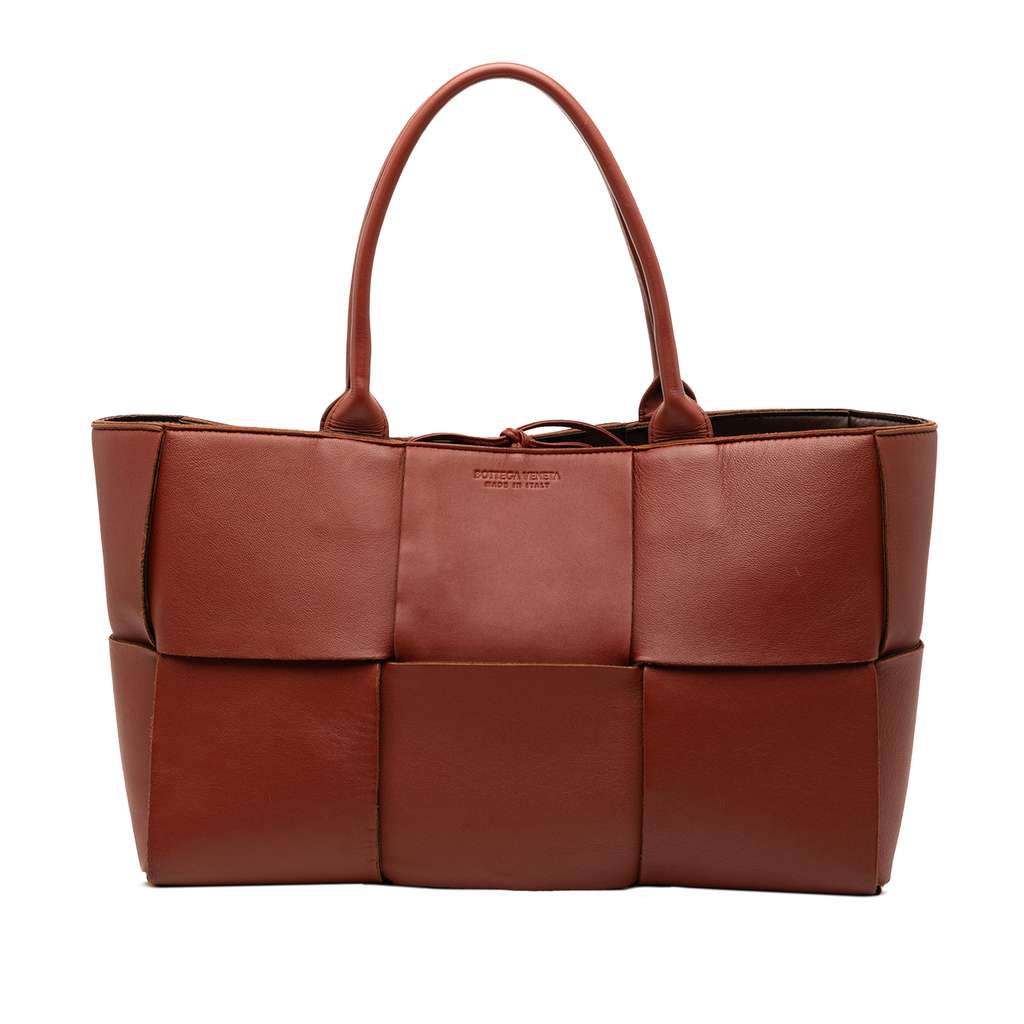 The Arco tote bag features a woven leather body, rolled leather top handles, an open top with leather knot closure, and a pouch inclusion.