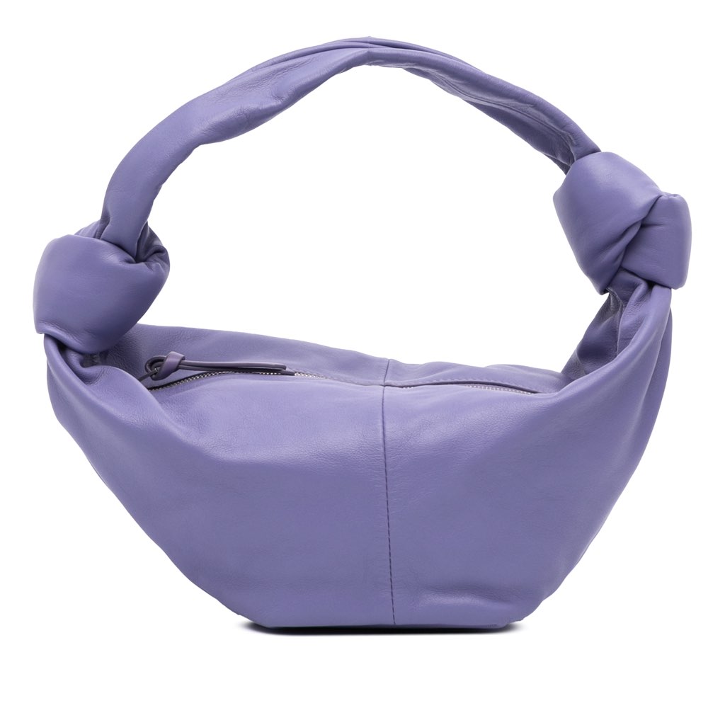 This handbag features a leather body, knot detail, flat leather handles, and a top zip closure.