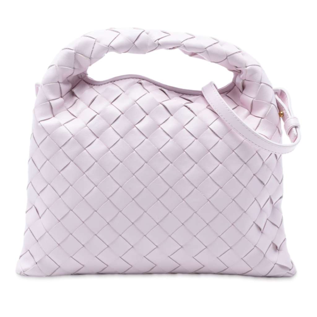 The Mini Hop features a woven leather body, a woven leather handle, an adjustable and detachable flat leather strap, an open top with snap button closure.