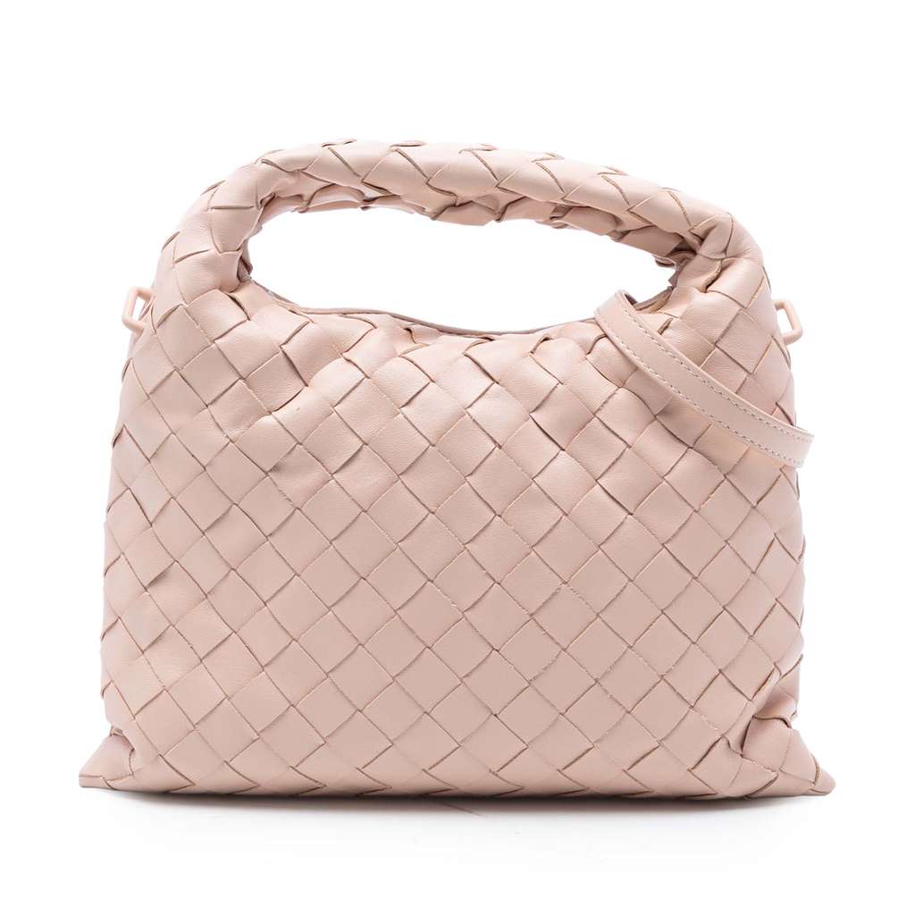The Mini Hop features a woven leather body, a woven leather handle, a flat leather strap, an open top with magnetic closure, and an interior zip pocket.