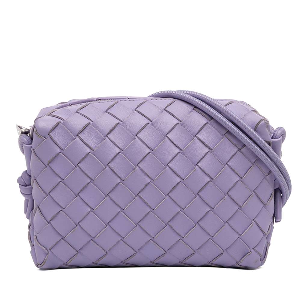 The Mini Loop features a woven lambskin leather body, rolled leather shoulder straps, and a top zip closure.
