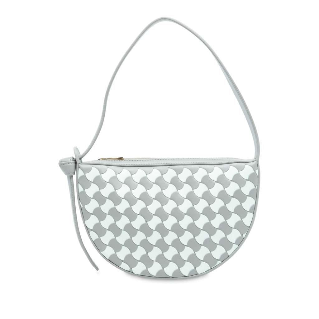 This shoulder bag features a woven leather body, flat shoulder strap, and a top zip closure.