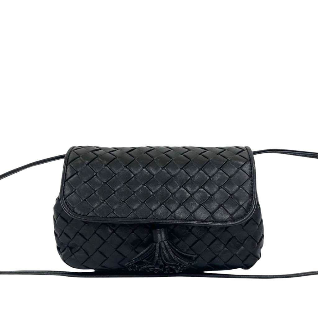 This crossbody features a woven nappa leather body, a flat leather strap, a front flap with magnetic closure, and an interior slip pocket.