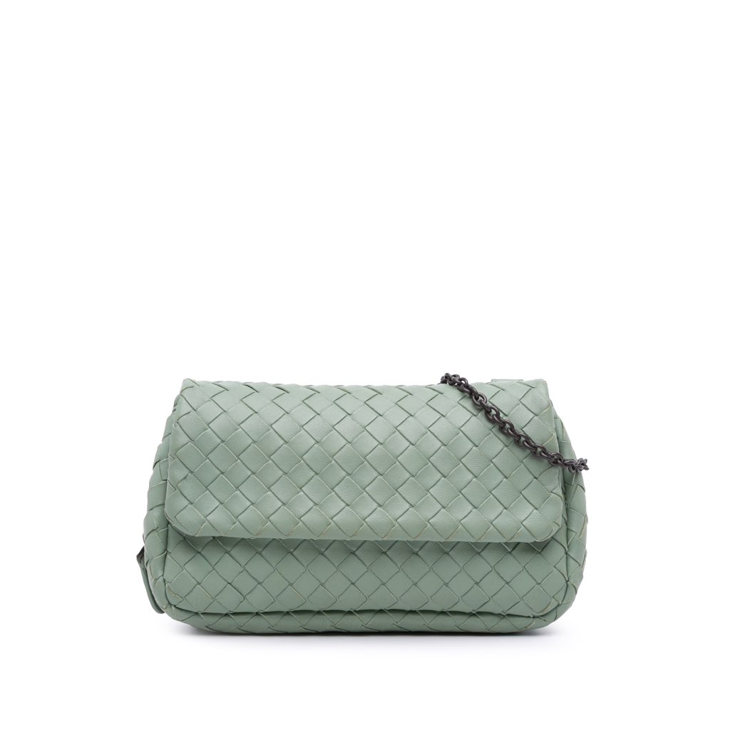 This crossbody bag features a woven leather body, a chain link strap, a flap with snap closure, a base expansion zip, and interior slip pockets.