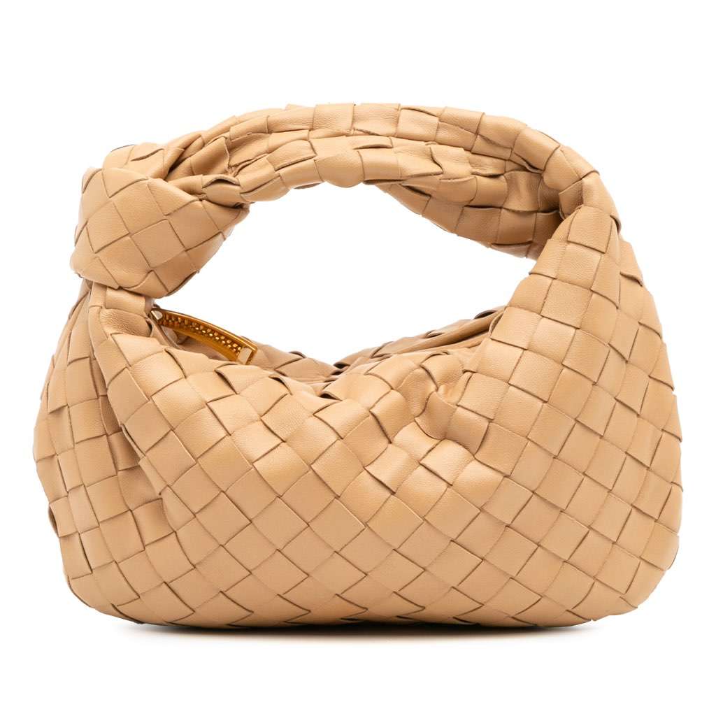 The Mini Jodie features a woven nappa leather body, a knotted woven leather handle, and a top zip closure.
