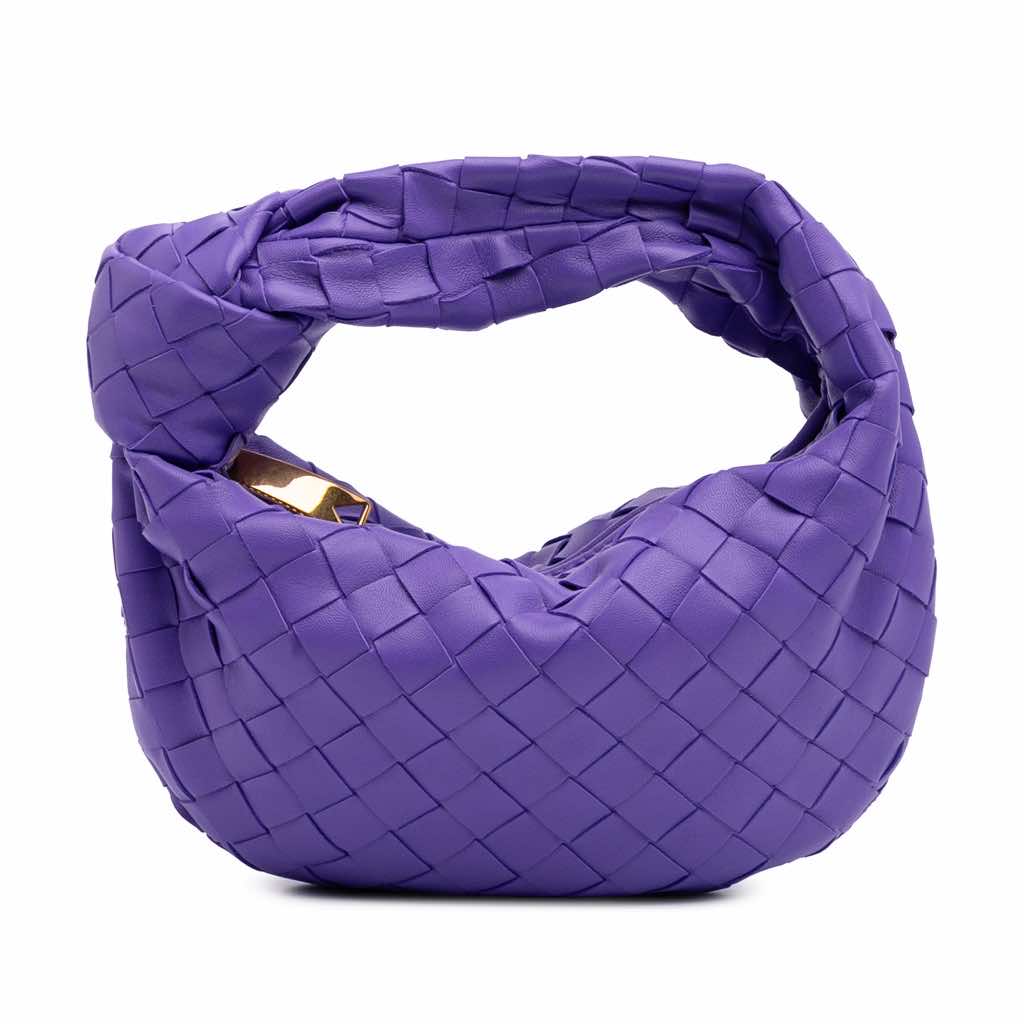 The Mini Jodie features a woven nappa leather body, a knotted woven leather handle, and a top zip closure.