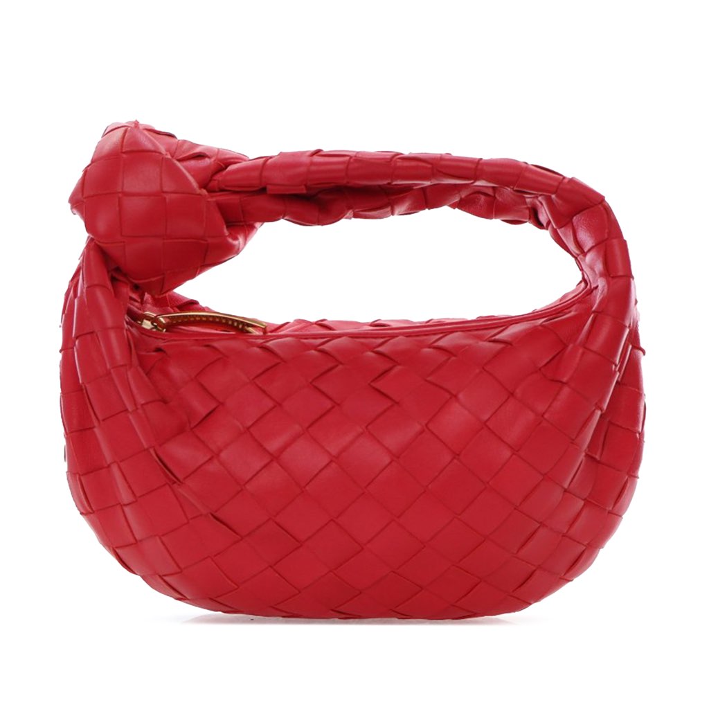 The Mini Jodie features a woven leather body, a knotted woven leather handle, and a top zip closure.