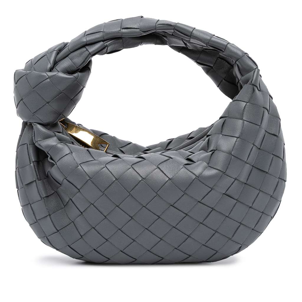 The Mini Jodie features a woven nappa leather body, a knotted woven leather handle, and a top zip closure.