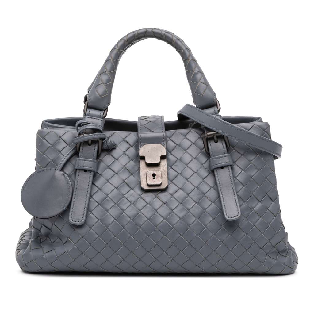 The Mini Roma satchel features a woven nappa leather body, rolled leather handles, a detachable flat leather strap, an open top with a strap and push lock and magnetic snap closure, interior compartments, and an interior zip pocket.