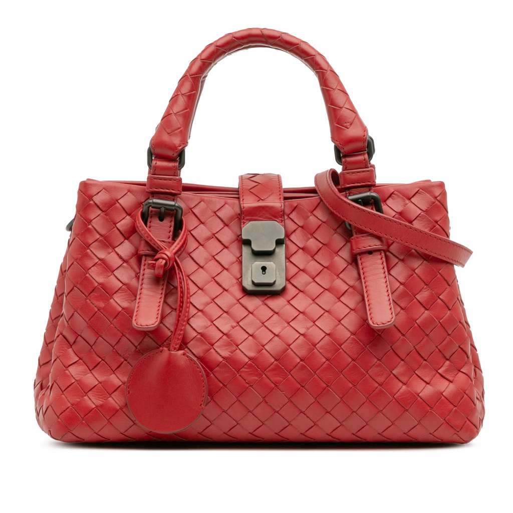 The Roma satchel features a woven nappa leather body, rolled handles, a detachable flat leather strap, a top strap with a push lock and magnetic closure, interior compartments, and an interior zip pocket.