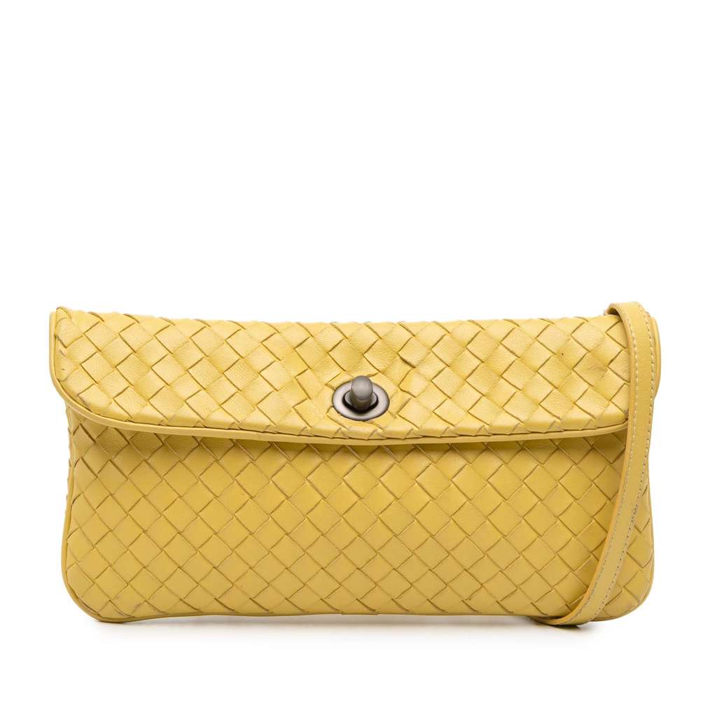 This crossbody features a woven nappa leather body, a flat leather strap, and a front flap with turn-lock closure.