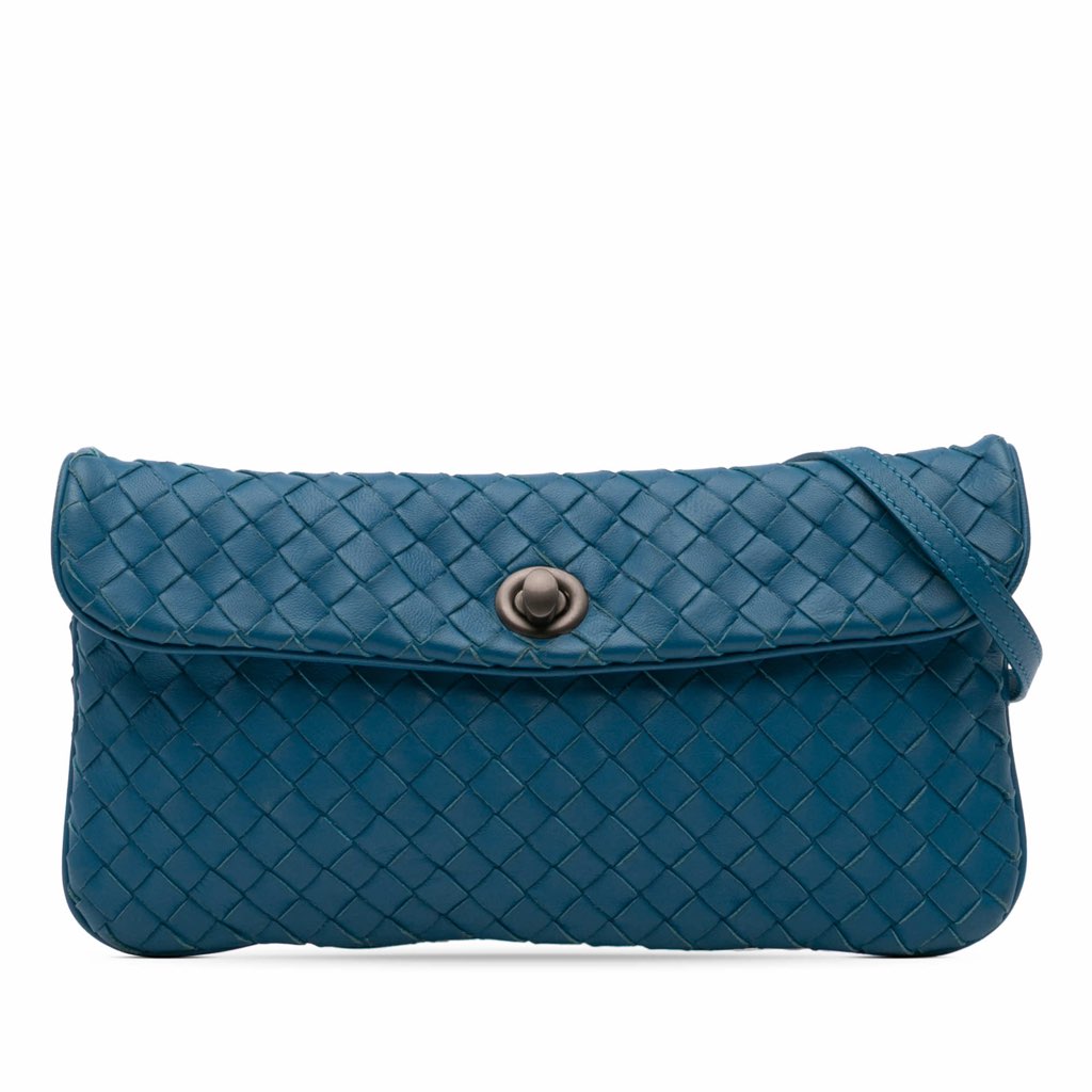 This crossbody features a woven nappa leather body, a flat leather strap, and a front flap with turn-lock closure.