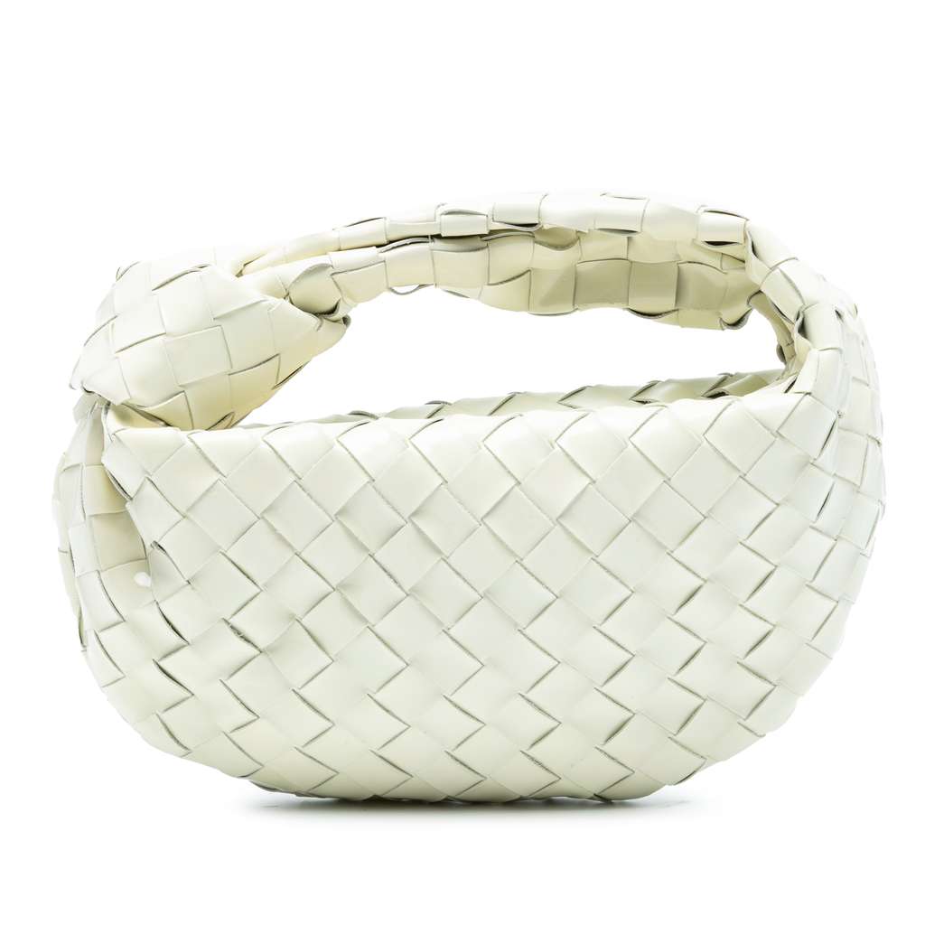 The Mini Jodie features a woven patent leather body, a knotted woven leather handle, and a top zip closure.