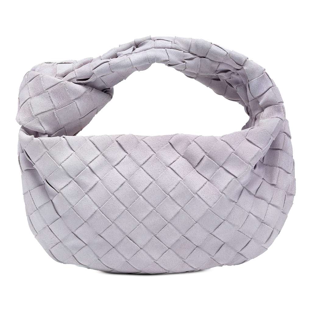 The Mini Intrecciato Jodie features a woven leather body, a knotted woven leather handle, and a top zip closure.